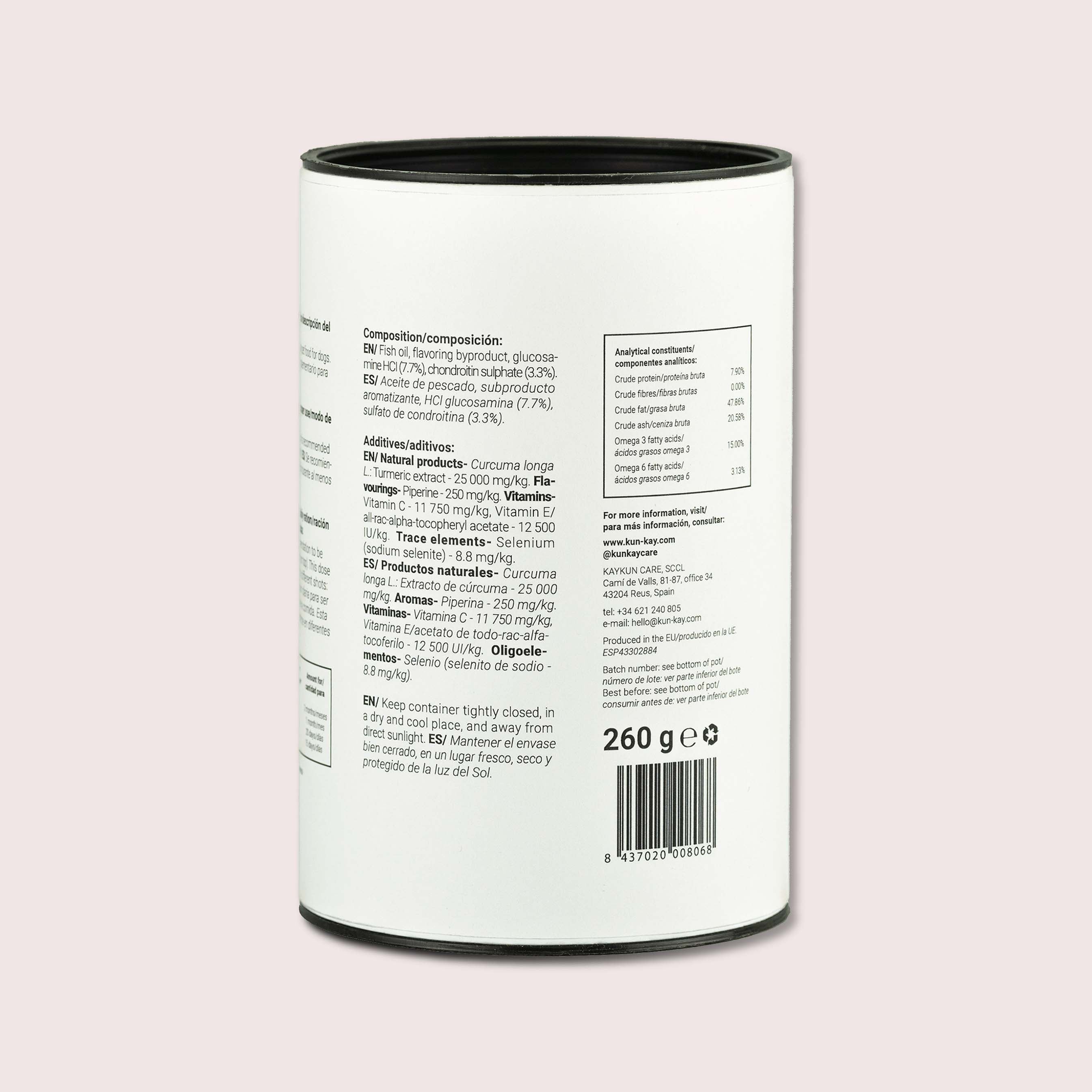 Con Arthrokun tu perro mantiene unas articulaciones sanas, reduce molestias articulares y previene la degeneración del cartílago e inflamación gracias a sus ingredientes activos naturales sinérgicos con propiedades condroprotectoras, antiinflamatorias y antioxidantes, es apto para perros de cualquier edad y resulta ideal para razas grandes de rápido crecimiento, mayores, obesos o con alta actividad física.