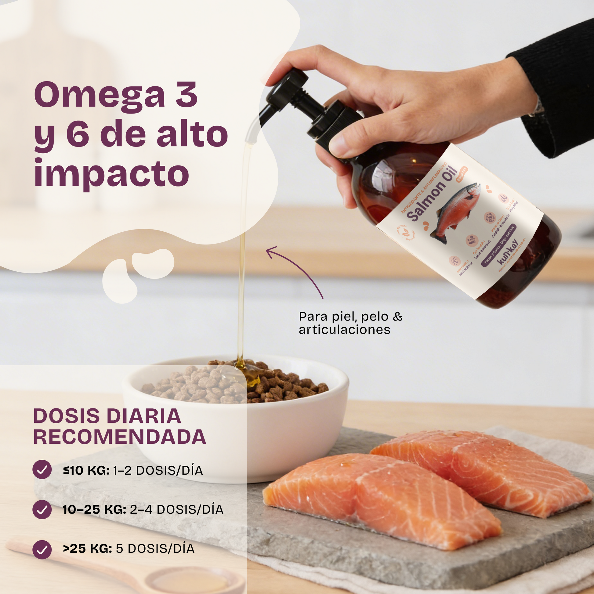 Buscábamos añadir omega 3 de calidad a la dieta de nuestra perra senior. La vemos más vital. Nos da tranquilidad que sea de KUNKAY
