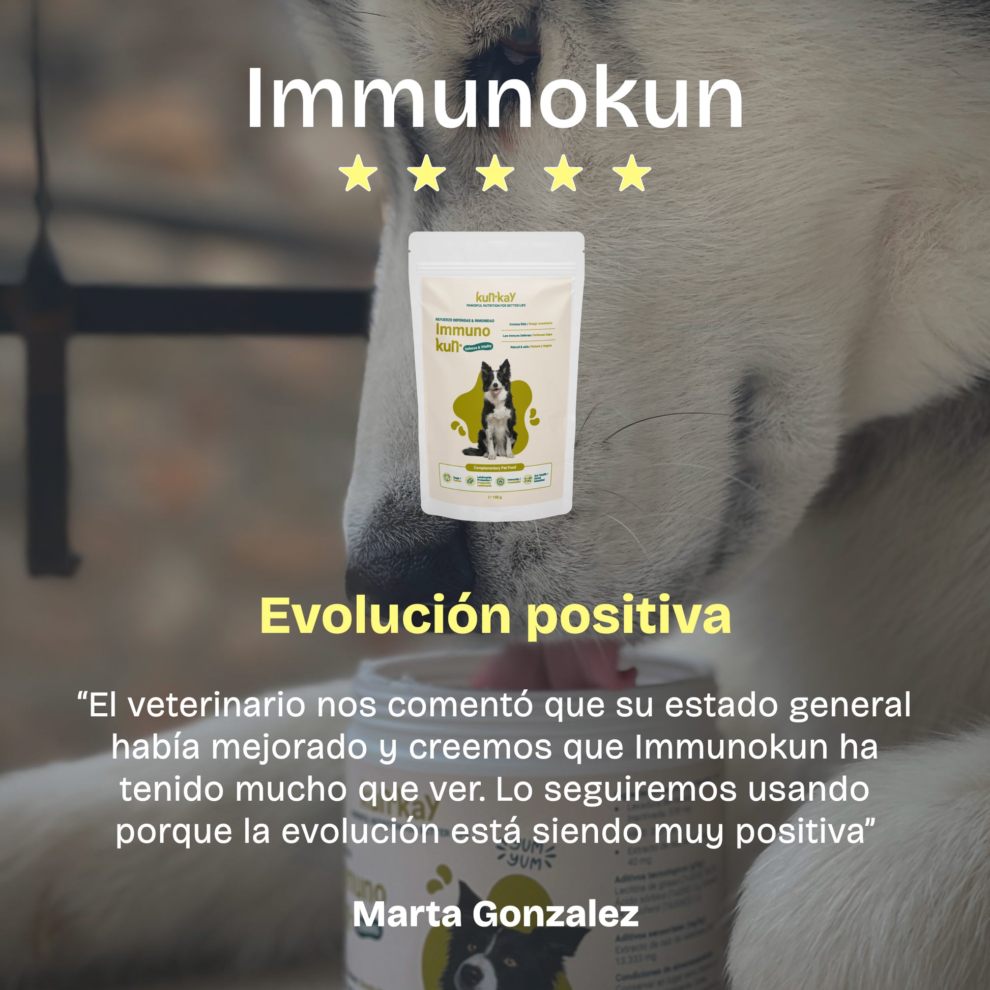 - Bei Hunden, die Leishmaniose-positiv sind oder an anderen infektiösen Krankheiten wie Parvovirose, Ehrlichiose, Räude, Ringelflechte oder Infektionen der Haut und der Atemwege leiden, reduziert Immunokun die Symptome und stoppt das Fortschreiten dieser Infektionen, wodurch die Lebensqualität Ihres Hundes verbessert wird.