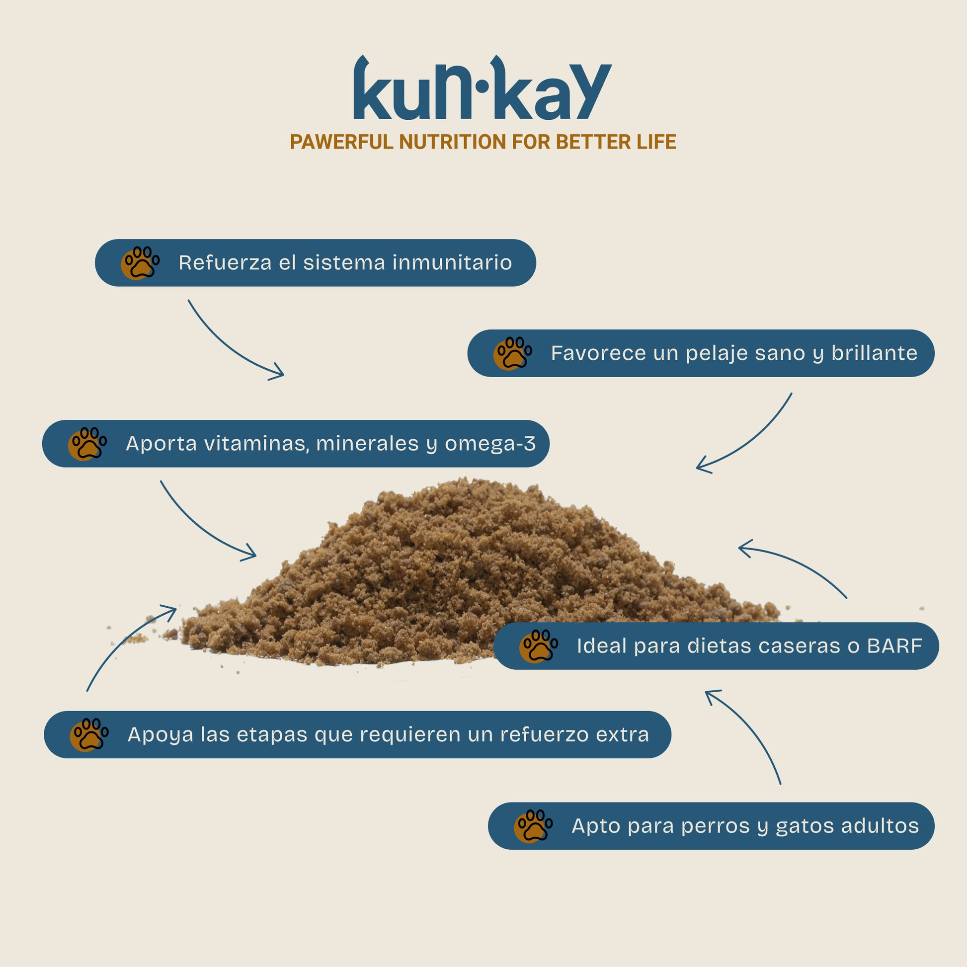 - Superbrownkun: Mischung aus Superfoods zur Förderung einer vollständigen und ausgewogenen Ernährung. Liefert zusätzliche Aminosäuren, Mineralien, Vitamine, Omega-3-Fettsäuren und präbiotische Fasern.