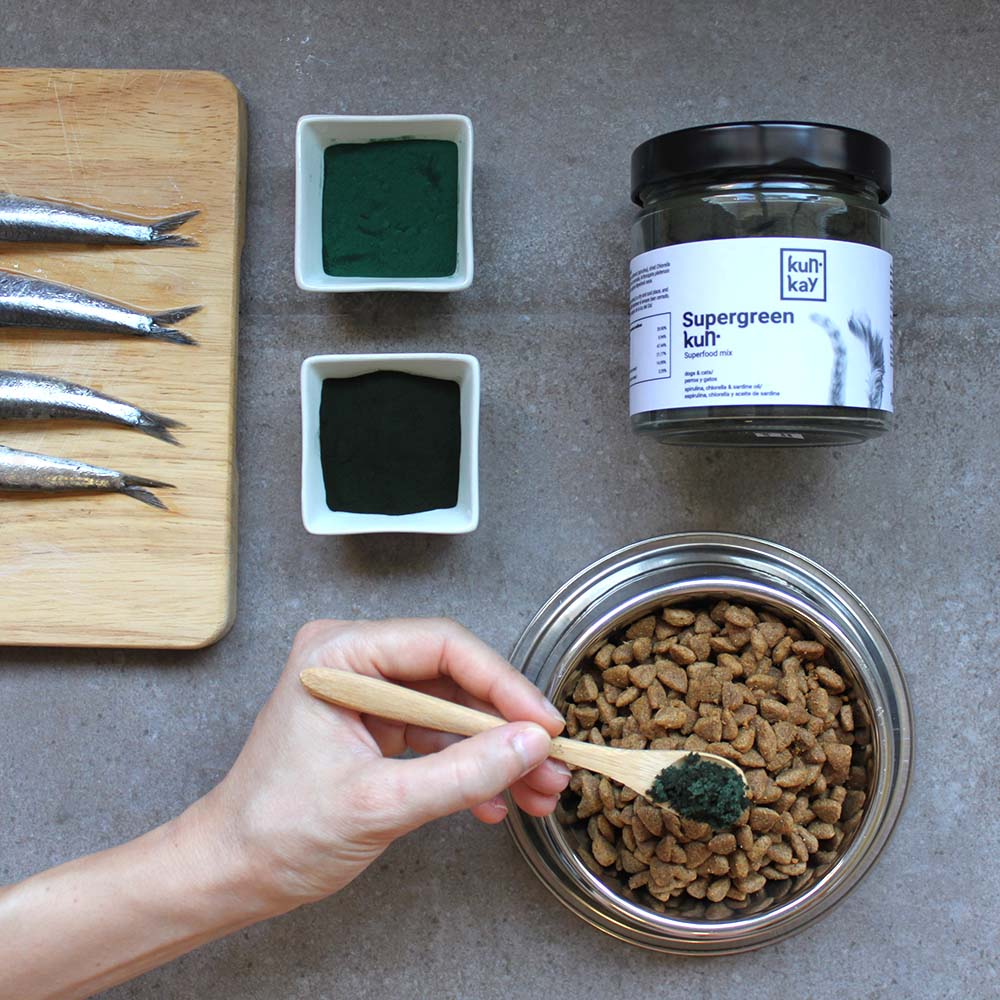 - Zur Ergänzung von hausgemachten und kommerziellen Diäten: Die Verabreichung von Supergreenkun kann mit anderen Supplements der Superfoods-Linie abgewechselt werden, um eine vollständige und ausgewogene Ernährung sicherzustellen. Im Fall von hausgemachten Diäten empfehlen wir zusätzlich die Ergänzung mit Homemadekun, um die korrekte Versorgung mit Vitaminen und Mineralstoffen zu gewährleisten.