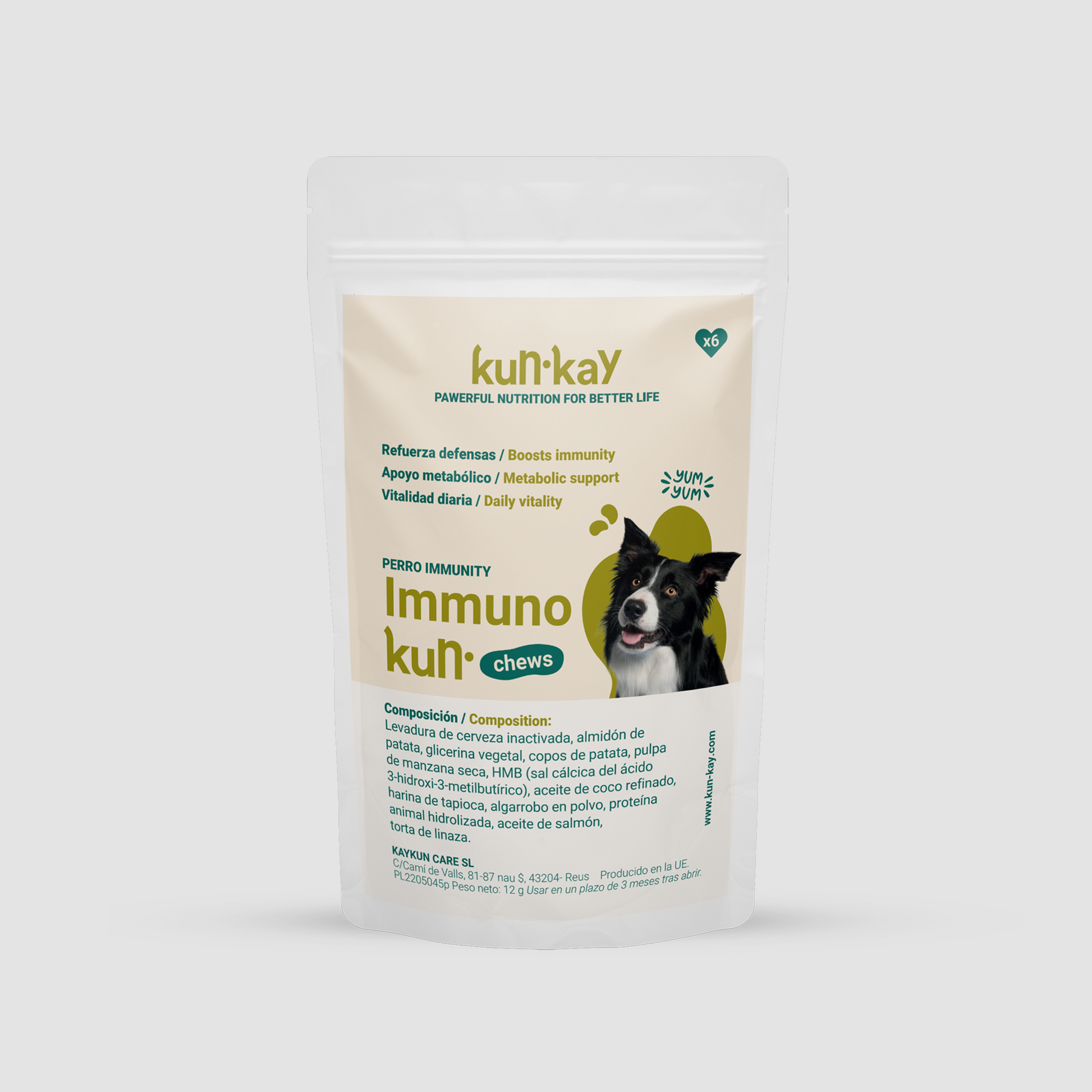 Avec Immunokun chews, votre chien obtient des défenses renforcées, il est idéal pour les chiots, seniors, obèses, en situation de stress, pendant la vaccination ou positifs à la Leishmaniose, stimule le système immunitaire, contrôle la Leishmaniose et améliore sa santé et qualité de vie, étant adapté à tout âge.