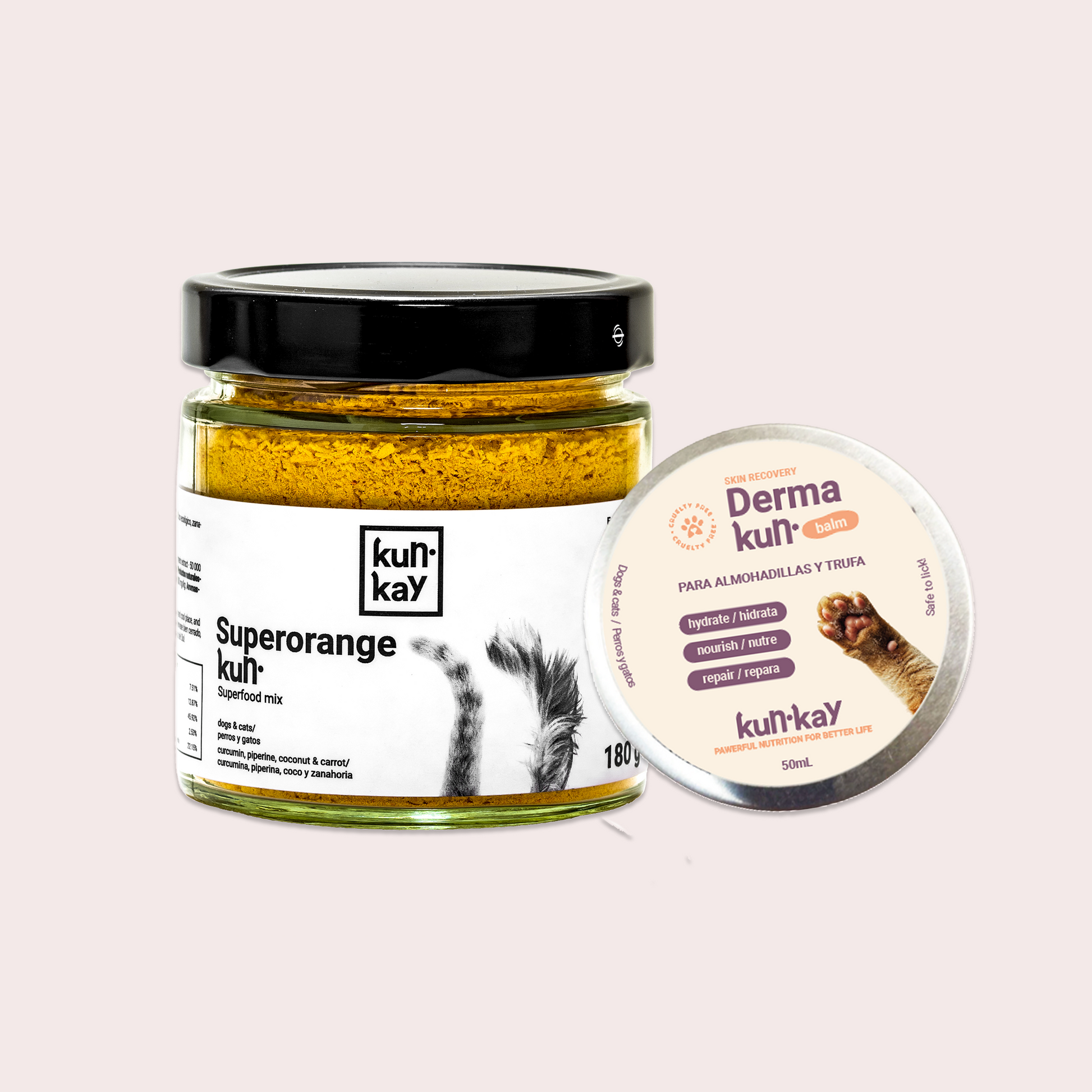 Superorangekun réduit l'inflammation et les douleurs articulaires ou cutanées, et Dermakun Balm hydrate, répare et protège la peau, la truffe et les coussinets. Le pack parfait pour prendre soin de votre compagnon à quatre pattes de l'intérieur comme de l'extérieur.
