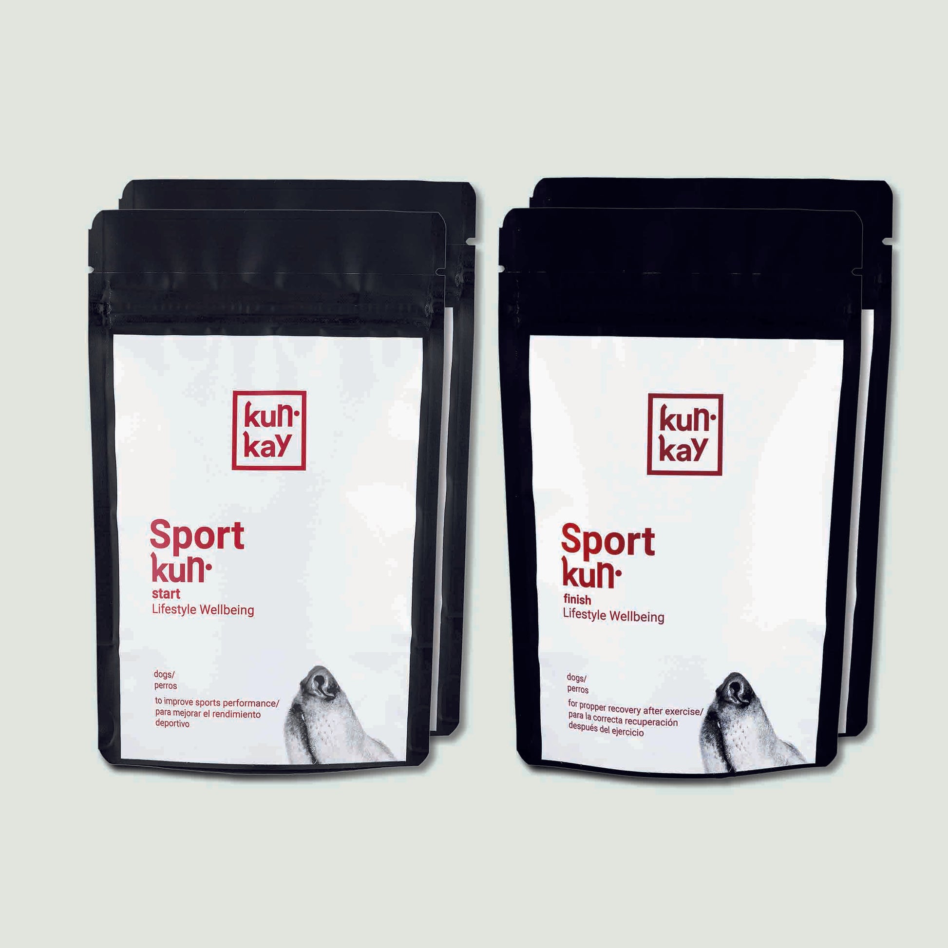 - Sportkun Start: suplemento diseñado para maximizar el rendimiento, energía y circulación muscular de perros deportistas antes del ejercicio.
