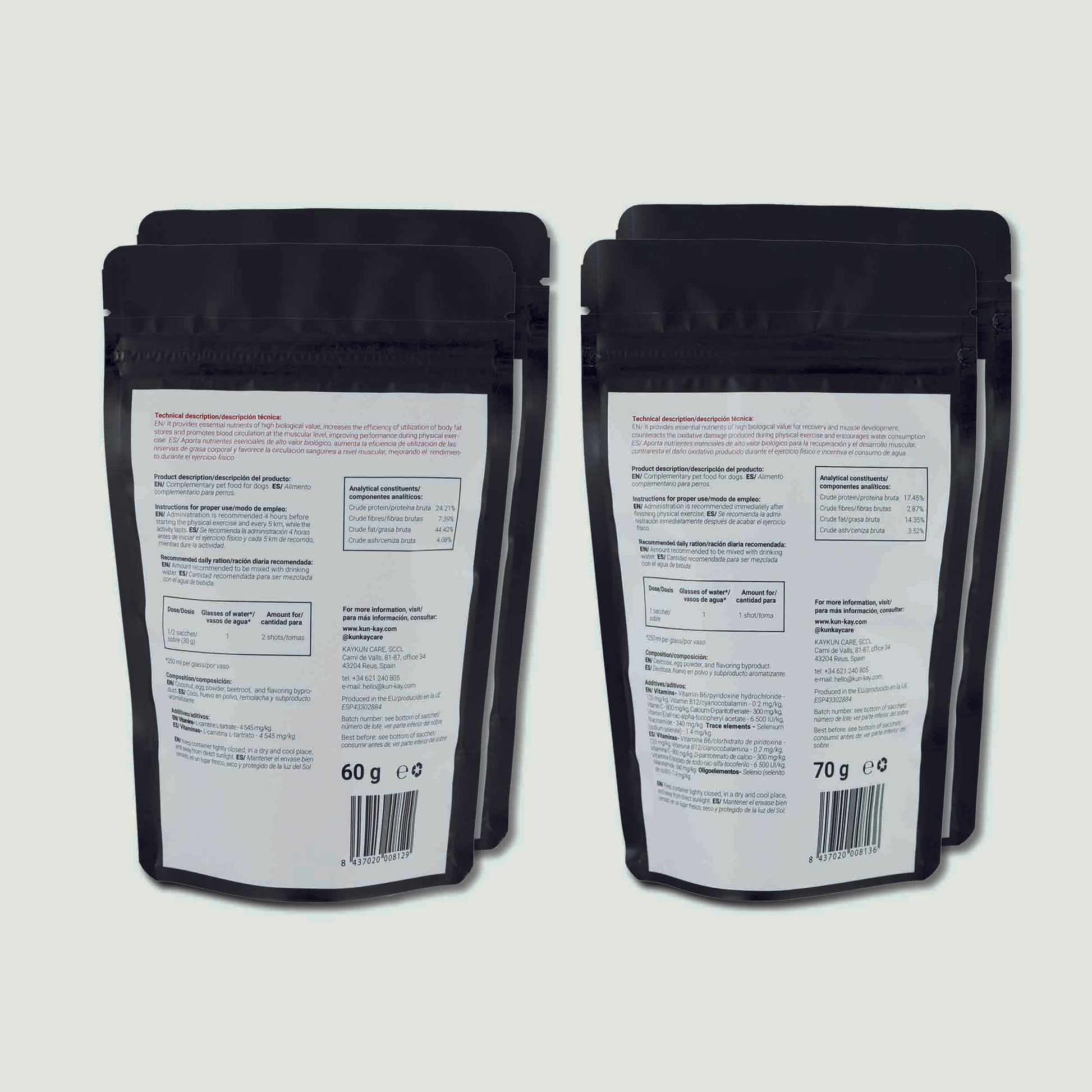 Sport Pack es el pack ideal para utilizar esos días en los que tenemos programada una actividad física de tipo intermedio o de resistencia con nuestro perro como canicross, bikejoring, agility o mushing. El Sportkun Start maximiza el rendimiento del animal durante la actividad física y el Sportkun Finish favorece una óptima recuperación muscular.