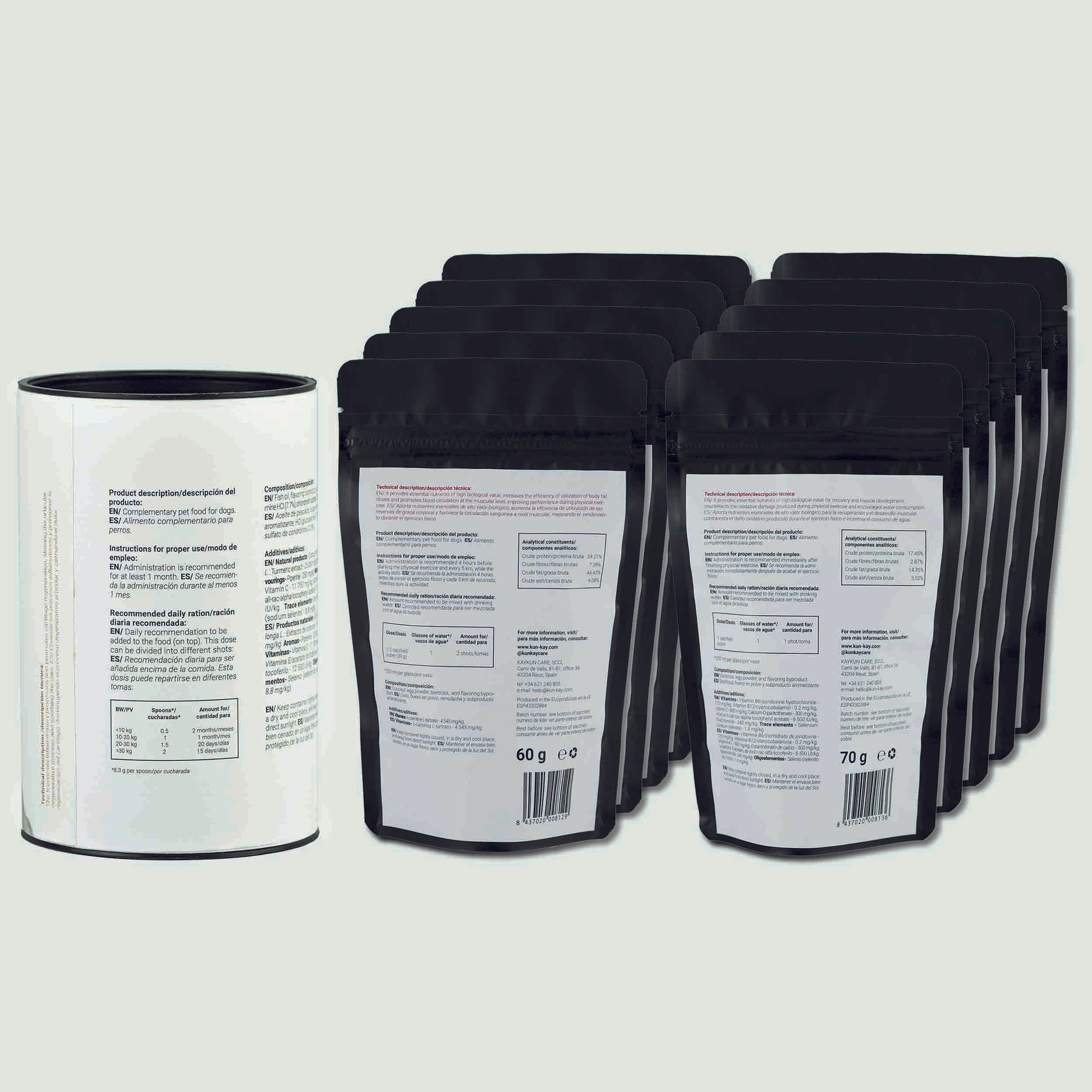 Además, el Arthrokun mantiene en buen estado la salud de las articulaciones, especialmente importante en animales de razas grandes o perros que gozan de un alto nivel de actividad física. El Athelete Pack es el complemento perfecto para mejorar el rendimiento físico durante periodos de entrenamiento, competición o bien actividades deportivas puntuales, así como para mantener una buena salud articular en perros con un alto nivel de actividad física.