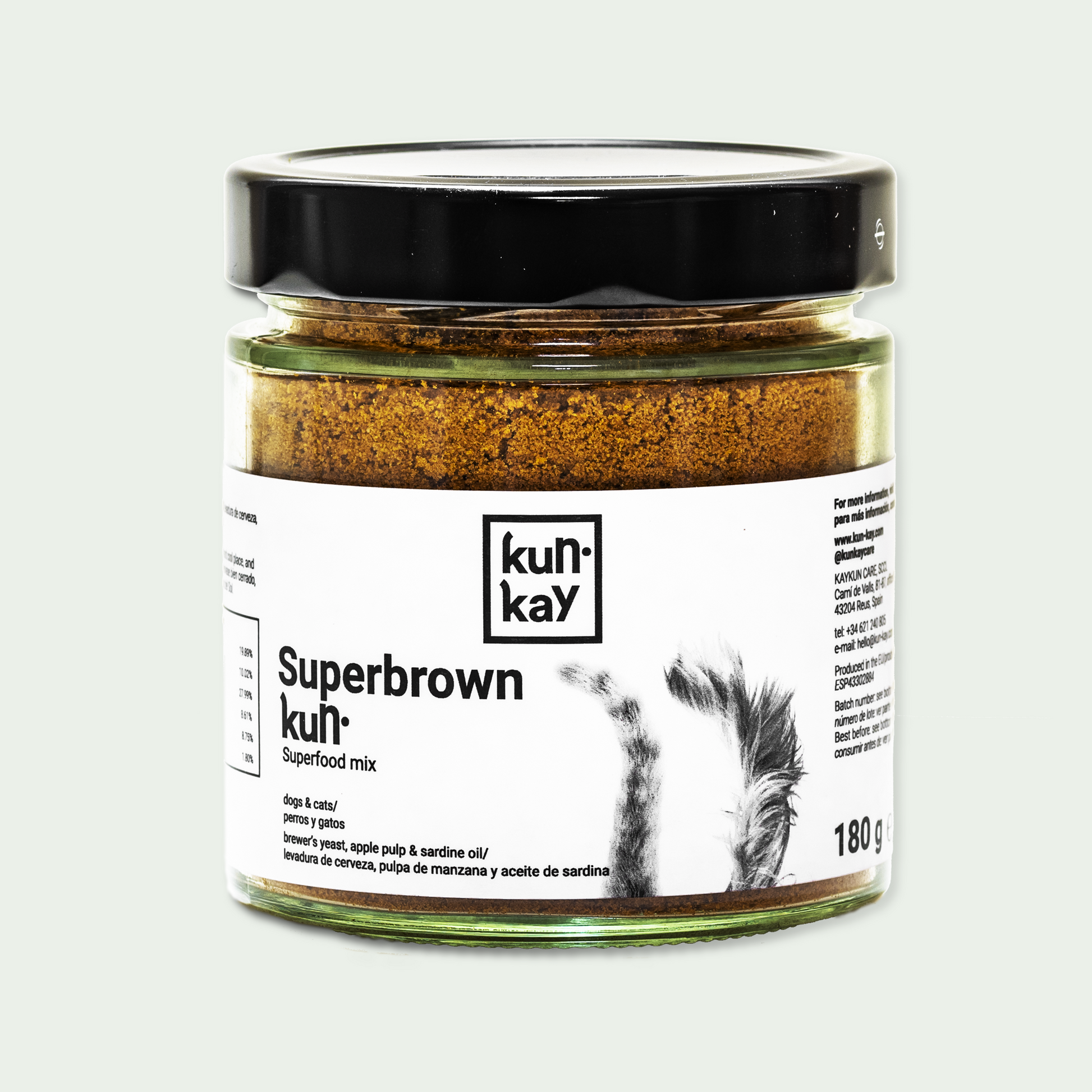- Superbrownkun está indicado para suplementar dietas caseiras (cozinhadas, BARF, etc.) e fornecer um aporte extra de minerais, vitaminas, ácidos gordos ómega 3 e fibra. Quando preparamos receitas caseiras, não podemos fazer o mesmo controlo das matérias-primas nem seguir uma alimentação totalmente completa, tendo em conta que um cão necessita de cerca de 37 nutrientes para a sua correta saúde e os gatos 40. Este suplemento é a sua ferramenta para assegurar uma dieta completa e equilibrada ao seu peludo, maximizando o seu bem-estar e prolongando o tempo de desfrute juntos.