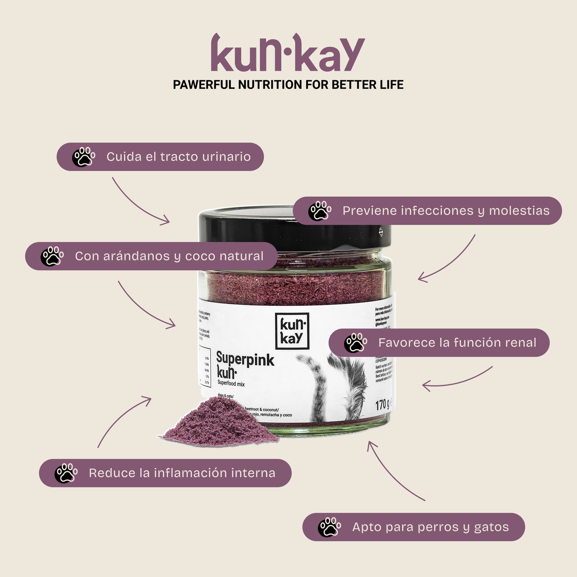 Com Superpinkkun o seu animal de estimação mantém um bem-estar do trato urinário, reduz incómodos urinários e previne a sua ocorrência, é formulado com superalimentos naturais (arándano azul e vermelho, beterraba e coco) e é apto para cães e gatos de qualquer idade.